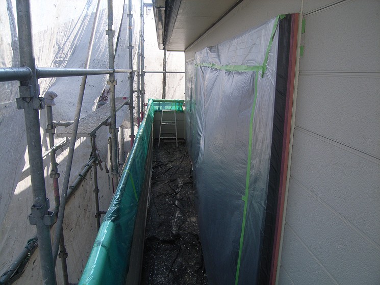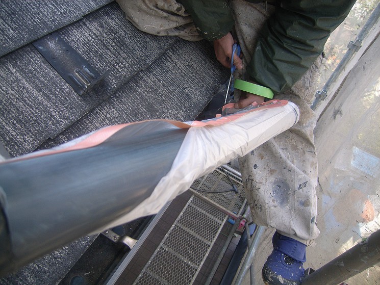 下屋根の養生がもう少しで終わると,2階部分の養生は完了します。