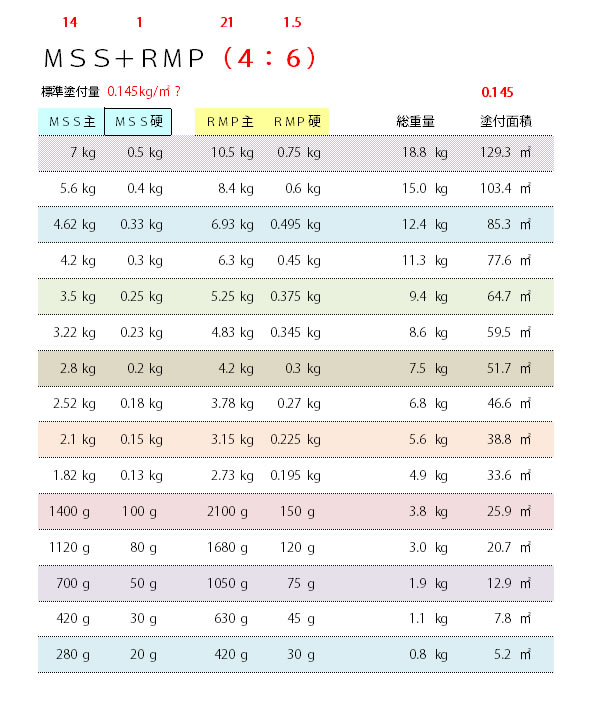 塗料ごとに混合比率と希釈率が異なるため全部の配合表を作ってあります。